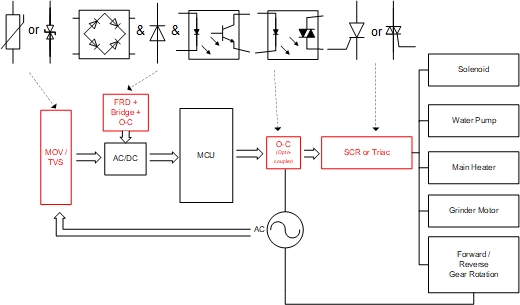 人们把电子技术应用到咖啡机上,实现了磨粉、压粉、装粉、冲泡、清除残渣等酿制咖啡全过程的自动控制,创造了全自动电子咖啡机。 应用于消费电子领域,MYBALL迈博微电 能提供比较齐全的元件解决方案。比如:AC 输入端防浪涌的压敏电阻(MOV)、电源部分用快恢复二极管(FRD, fast recovery diode)及整流桥(Bridge)、光电隔离器件(Opto-coupler)、控制负载通断的可控硅(SCR & Triac)等。