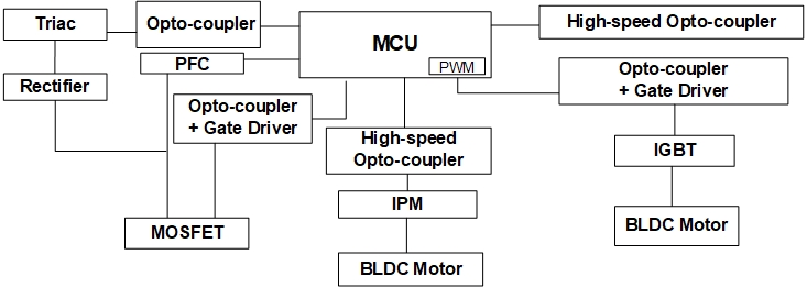 在全球气候变暖的当下,空调在白色家电中占有举足轻重的地位。典型的空调系统由室外机、室内机和电源单元组成。对于电源单元,MYBALL迈博微电 具有高隔离电压光电耦合器,用于隔离 PWM 和 PFC。对于室内机,MCU 控制与光电耦合器结合的风扇模块、与光电三端双向可控硅开关和外围设备结合的加热器开关。主隔离 MCU 和相关外围设备,确保电路的可靠性。对于室外机,使用 MCU 控制风扇和压缩机的电机系统。电机控制系统是各种家用电器的组成部分。每一个单独模块都取决于安全和环境保护要求、性能要求,当然还有制造成本。因此,在设计家用电器时,需要加强对单片机和外围设备对应用电路的隔离,以确保电路的低噪声。