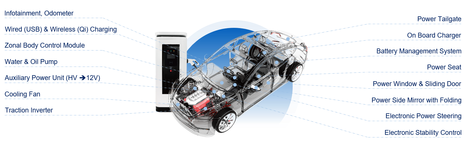 MYBALL迈博微电 车规级产品 (MOSFET, TVS) 广泛应用于车灯照明及新能源汽车电源应用。 车规级 MOSFET 通过先进的工艺制程,提供优异的电气特性如 RDS(ON) 和 Qg,非常适合工作频率较高的开关电源应用。目前产品涵盖低压 40 ~ 60V、中压 100 ~ 150V、以及超结高压 650V 以上各类应用。 车规级 TVS 采用独特的 CLIP 结构,相对于传统的 A+B 结构,可以避免虚焊,减少芯片应力,提供高可靠性。在性能上实现卓越的钳位能力、漏电流小、快速的响应速度,同时满足 AEC-Q101 等级测试规范。